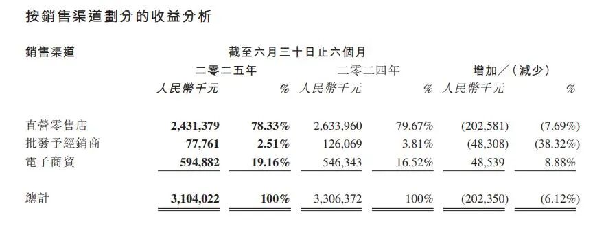 数据显示,截至2025年6月30日止六个月,赢家时尚实现收益约31.04亿元(即3,104.02百万元),较2024年同期的33.06亿元下降6.12%;实现纯利约2.89亿元(288.99百万元),同比增长2.17%,在营收承压的背景下实现利润微增。