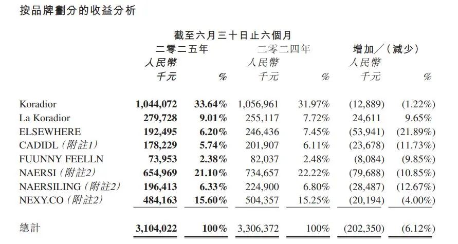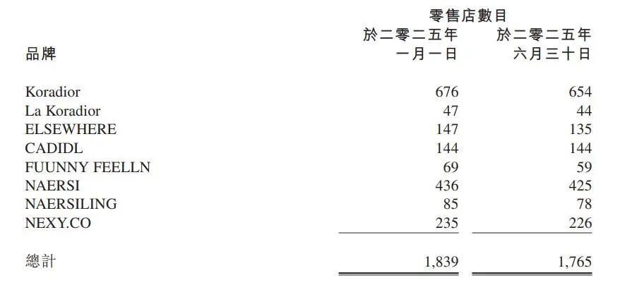 此外,经销商经营的零售门店为377家,较去年同期减少50家。其中,Koradior经销商门店最多(179家),NAERSI门店次之(85家),而La Koradior和NAERSLING分别仅剩1家和2家门店,反映出品牌网络调整的差异化策略。