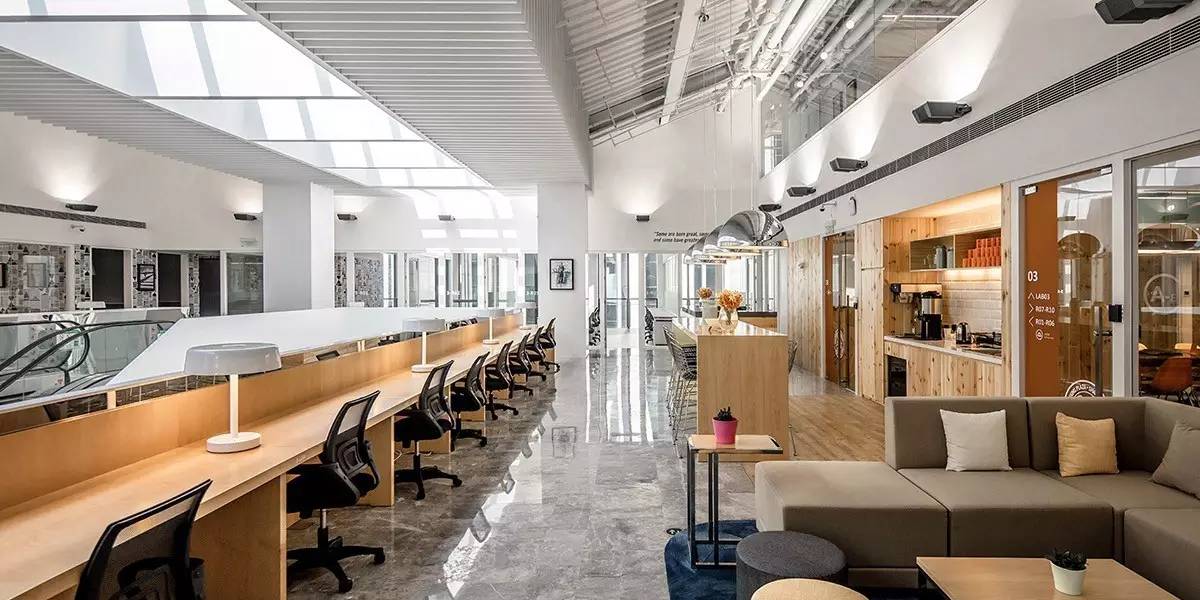 E楼3Q的设计中将色彩运用回归到相对温和的色系中,并着重体现暖色的亲近感。不仅如此,团队还为3Q引入了一个全新的固定家具模块类型——狭长的“公共空间”共享办公桌,将整个中庭的视野一览无余。