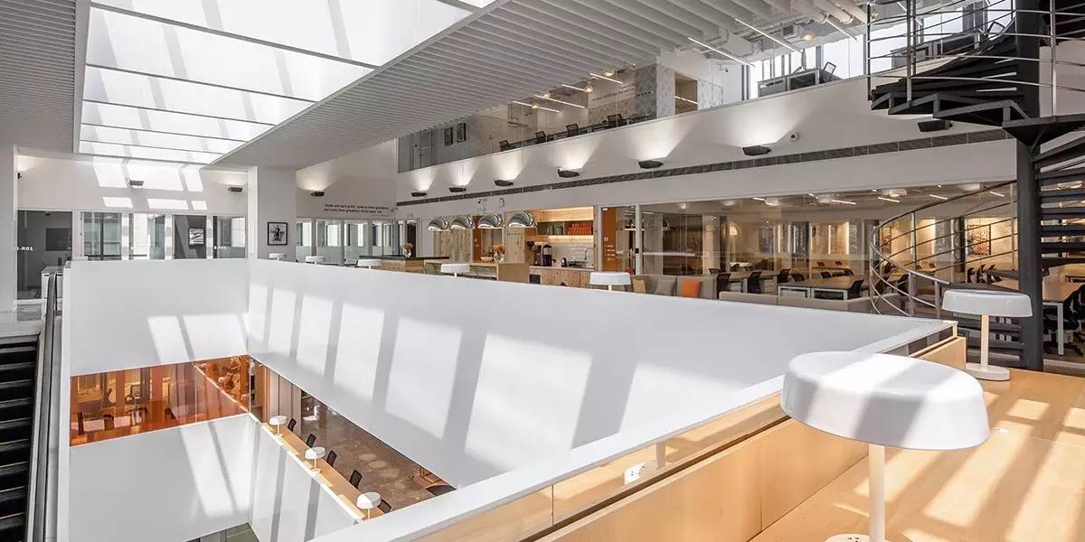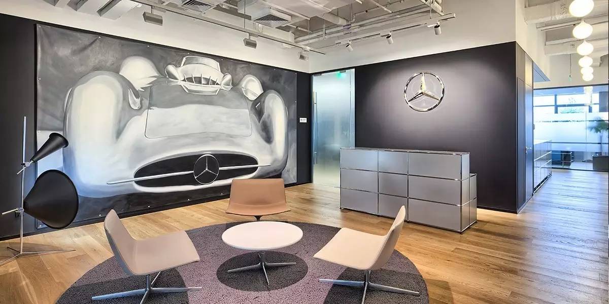 值得一提的还有梅赛德斯-奔驰高级设计中心,它的设计焦点在于为空间的多样使用者提供交流和频繁互动的媒介。看似立体悬空的弧形玻璃墙,将设计空间做了分隔,却不完全封闭。